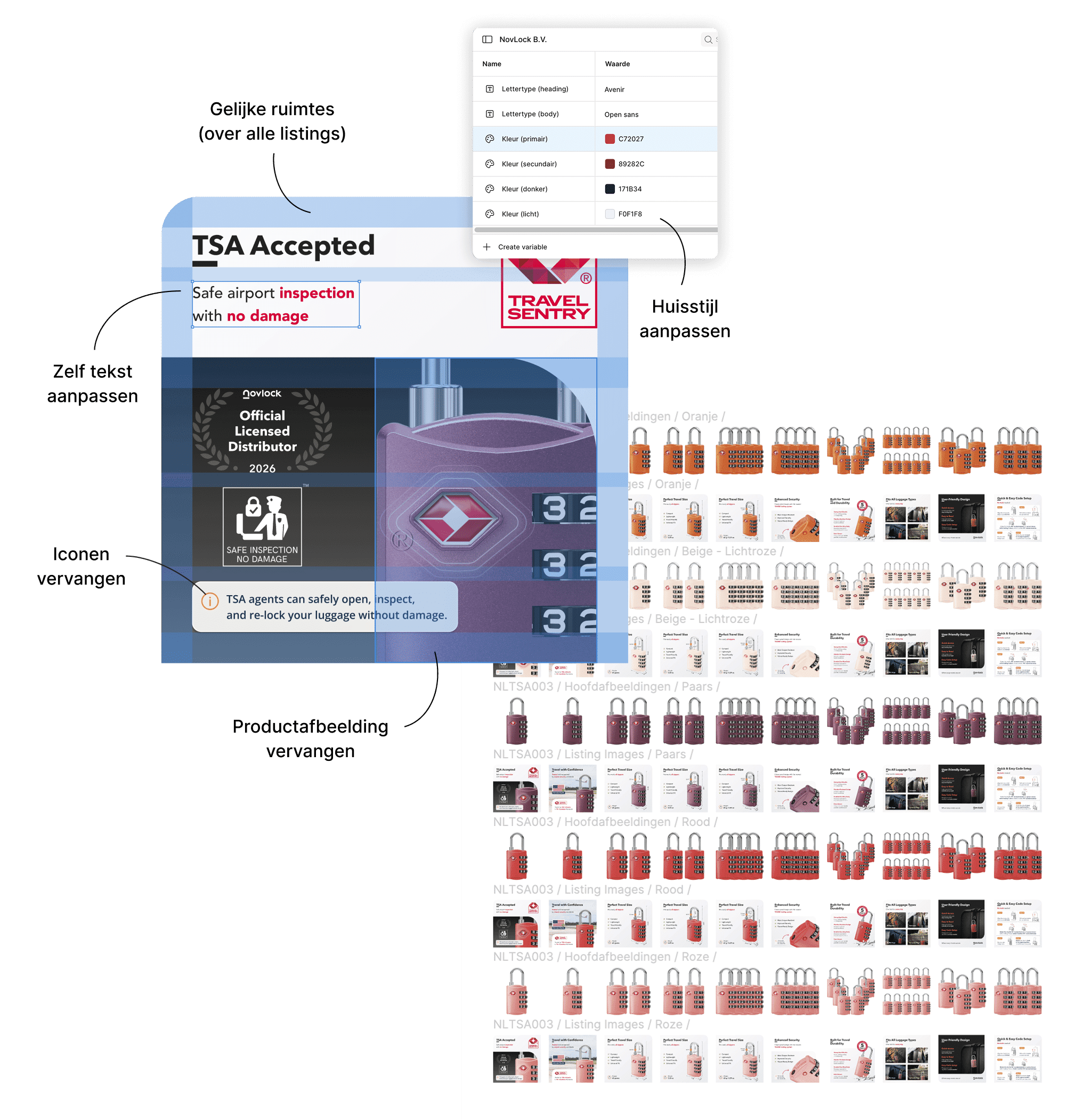 Wij ontwikkelen schaalbare listing templates: een slimme omgeving waarin productlistings één keer ontworpen worden en daarna eenvoudig opnieuw gebruikt en aangepast kunnen worden. In plaats van voor elk product een nieuw design te maken, bouw je een flexibele listing-templates waarbij teksten, afbeeldingen, USP’s en andere elementen aangepast kunnen worden. Hierdoor kun je razendsnel nieuwe listings maken voor producten binnen dezelfde niche of productlijn.